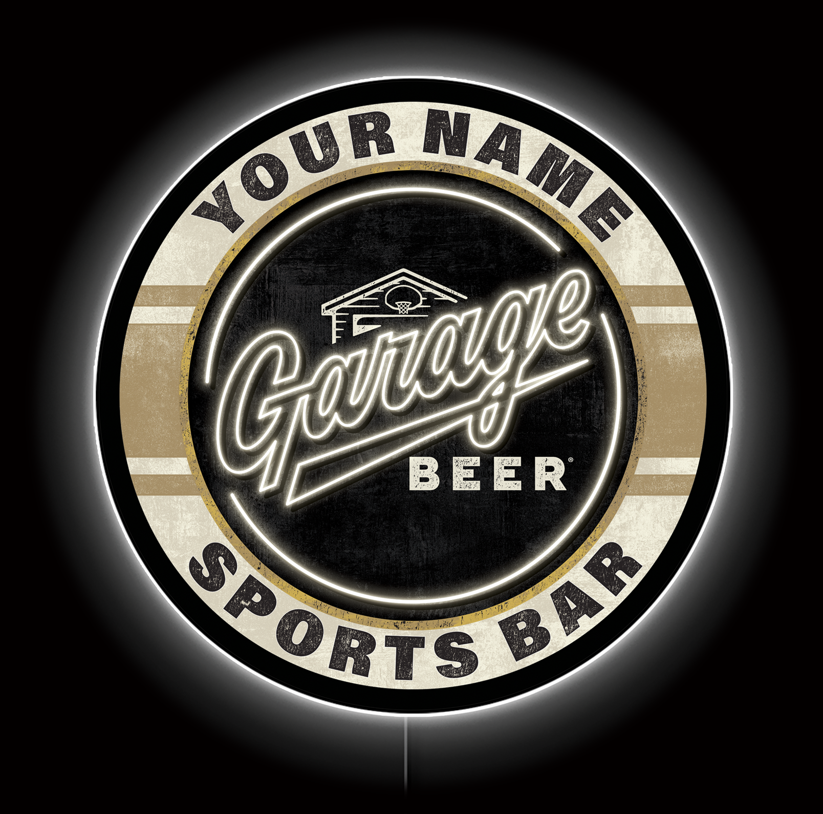 Transform your space with this Garage Sports Bar LED Sign. This custom sign is designed with a vintage, distressed look, featuring a bold "Garage Sports Bar" message that's perfect for a man cave, home bar, or game room. The sign is encircled by a bright, LED halo, giving it a warm, inviting glow that's sure to catch the eye.