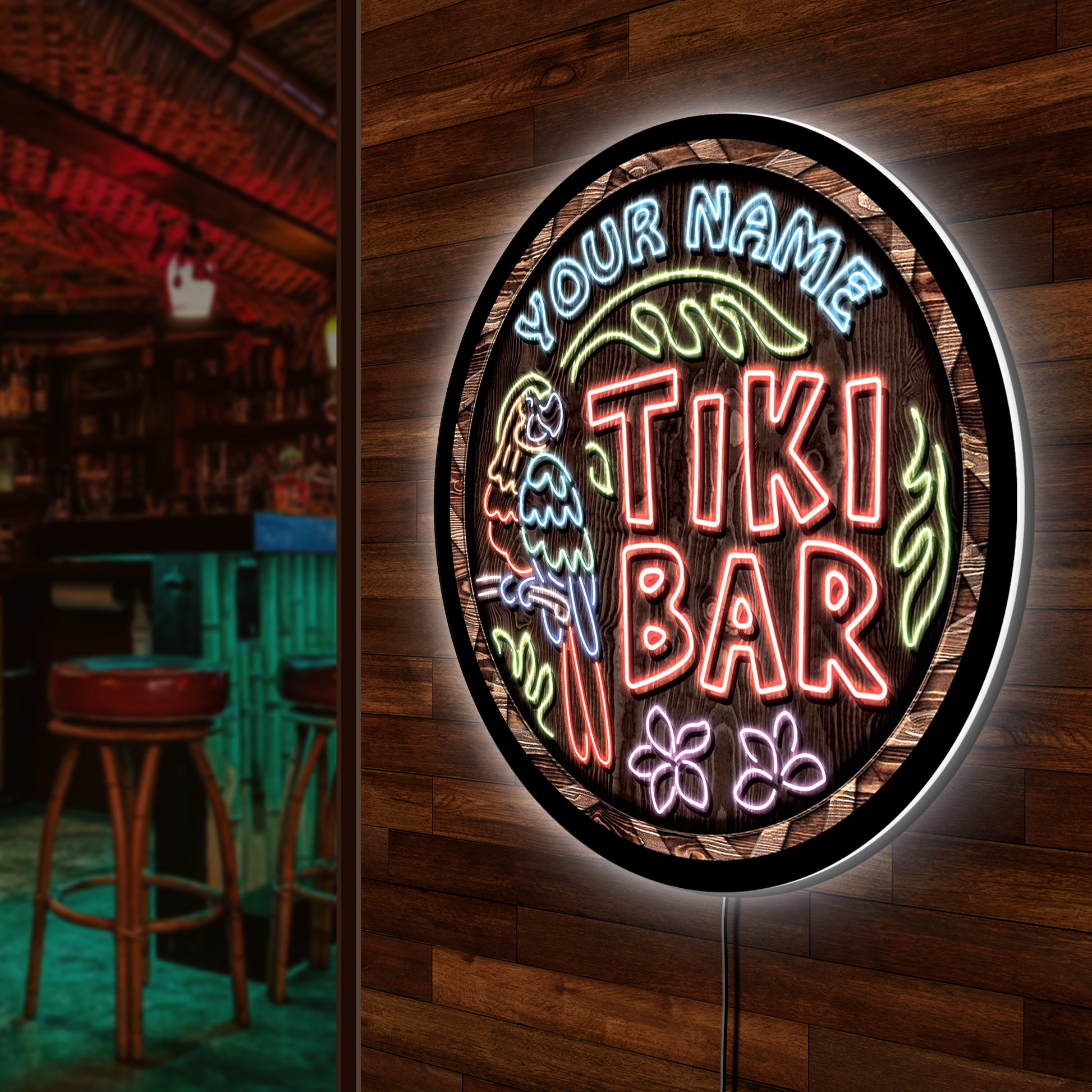 Make a bold statement with our stunning Tiki Bar Custom LED designed to add a modern, personalized touch to any room. With a sleek, custom name feature and an impressive 23-inch diameter, this sign is perfect for creating a unique and eye-catching display in your home, office, or event space.